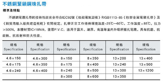 产品材质:不绣钢扎带采用UL认可尼龙66(Nylon 66)材料注塑制成,防火等级94V-2,具有良好的耐酸、腐蚀、绝缘性,不易老化、承受力强。操作温度为-20℃到+80℃(普通尼龙66)。